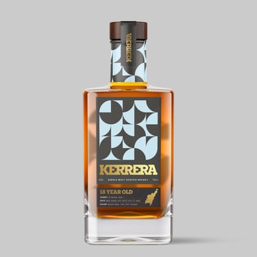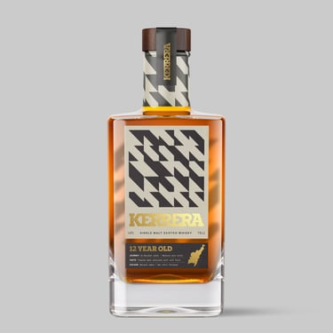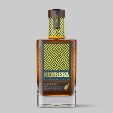 Welcome to Kerrera Single Malt Scotch Whisky – a strikingly contemporary brand, seamlessly blending tradition with modernity. Encased in a bottle adorned with bold abstract patterns and sleek typography, it commands attention on any shelf. The packaging reflects its essence: a daring challenger brand that isn’t afraid to defy norms and push boundaries.